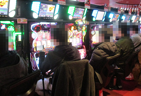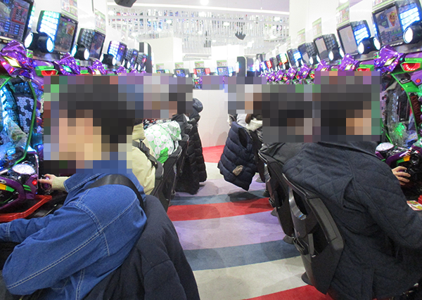 夕方頃のパチスロをうかがうと、新台の「パチスロ ヱヴァンゲリヲン AT777」が満席。鮮やかな光景が広がっていたこともあり、たくさんのプレイヤーが足をとめて遊技の様子を眺めていた。