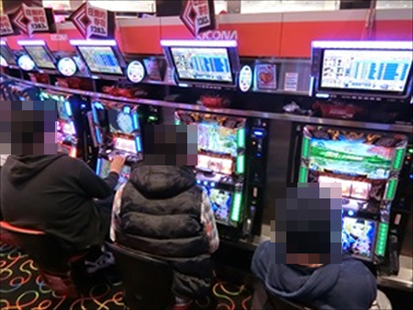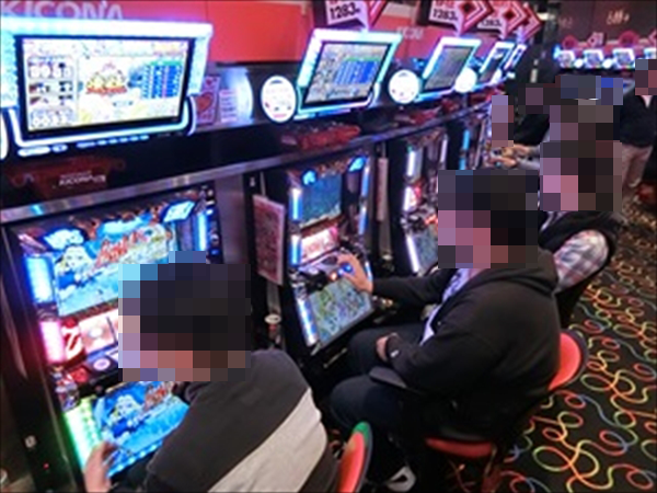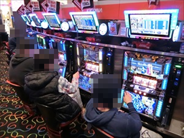 円を描くように台が設置されている特徴的なレイアウトのパチスロフロアをみると、さまざまなスペックの機種にステキなシーンがあった。