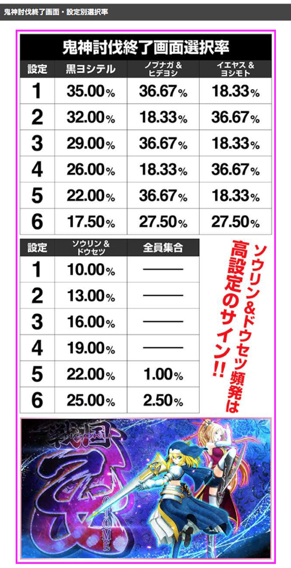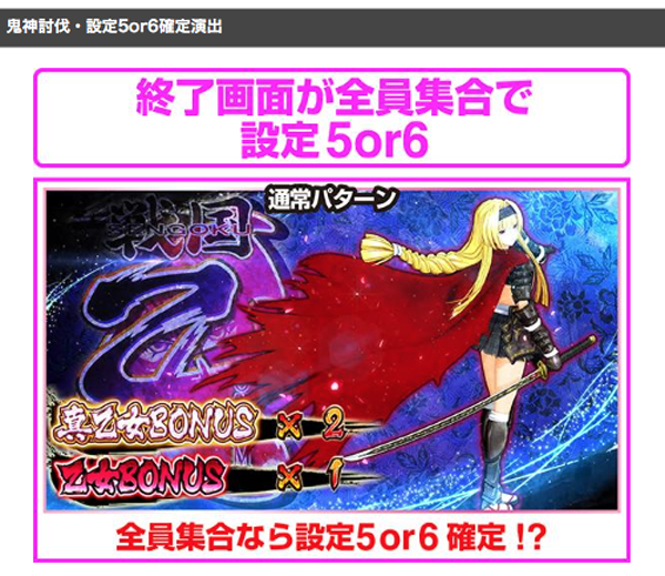 鬼神討伐終了後の内部状態移行率に設定差があり、設定5と6は高確Bの移行率が高い。