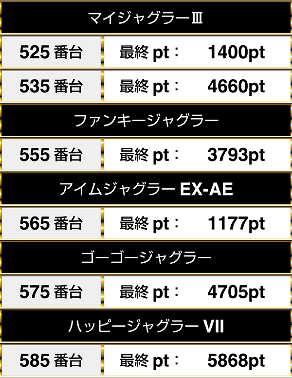 535番台の『マイジャグラーⅢ』や575番台の『ゴーゴージャグラー』なども、4000ptを上回っていた。