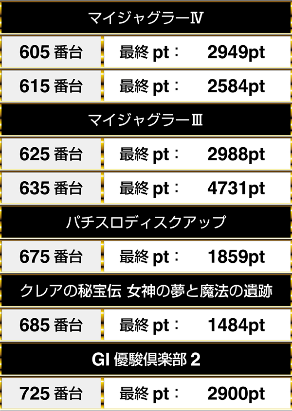 ジャグラーシリーズ以外にも、675番台の『パチスロディスクアップ』や725番台の『GI優駿倶楽部2』などがプラスptでこの日を終えていた。