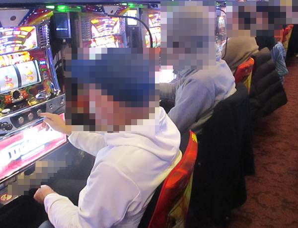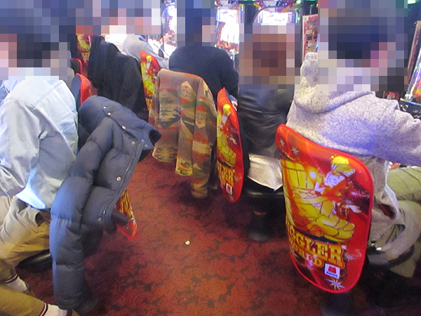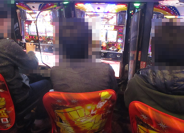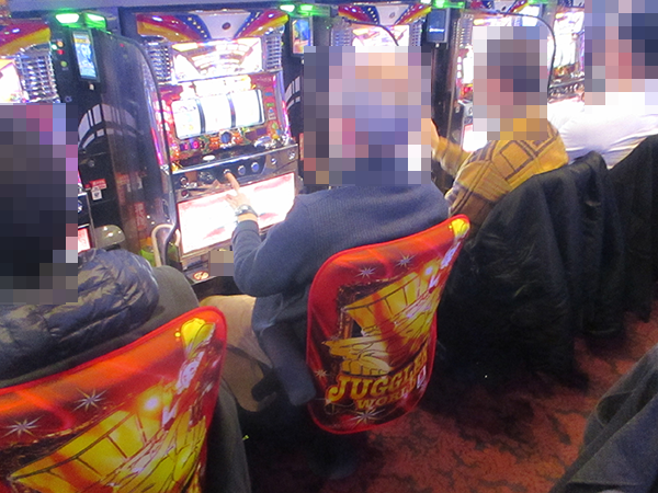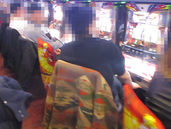 大勢のプレイヤーが笑みを浮かべて遊技をおこなっており、AT・ART機とボーナスタイプの両方が高稼働。