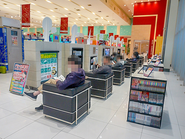 レストスペースには幅広いジャンルの漫画本が並んでおり、取材時も満喫するプレイヤーが多かった。