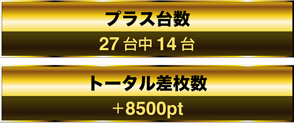 17時頃は27台中19台が稼働しており、最終的には半数以上の台がプラスの差枚を記録していた。