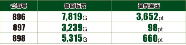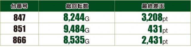 終わってみると荒波機種にも関わらず3千pt超を筆頭に全台プラス差玉となっていただけに、総回転数がもう少しあれば…と悔やまれた。