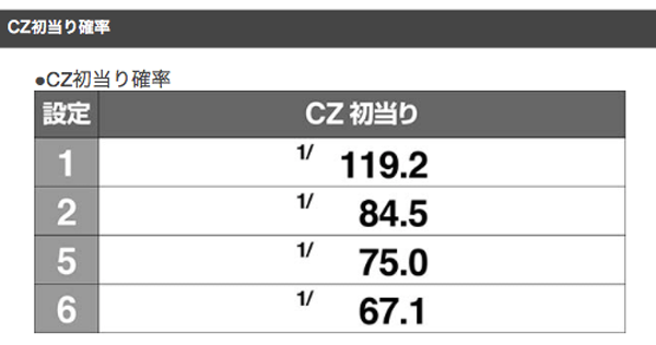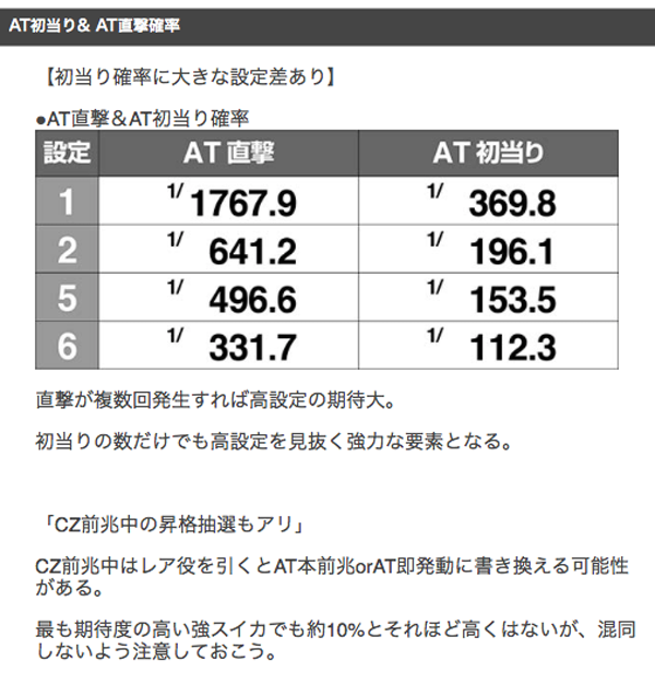 AT初当り確率とCZ確率は高設定ほど高い。AT直撃確率もチェックしておこう。