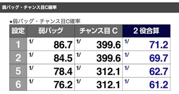 弱バッグとチャンス目Cの確率にも設定差があるため、サンプルを集めて設定推測に活かしたい。
