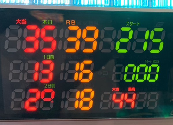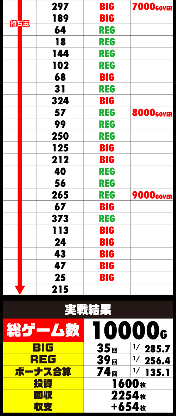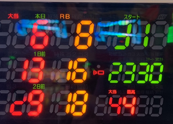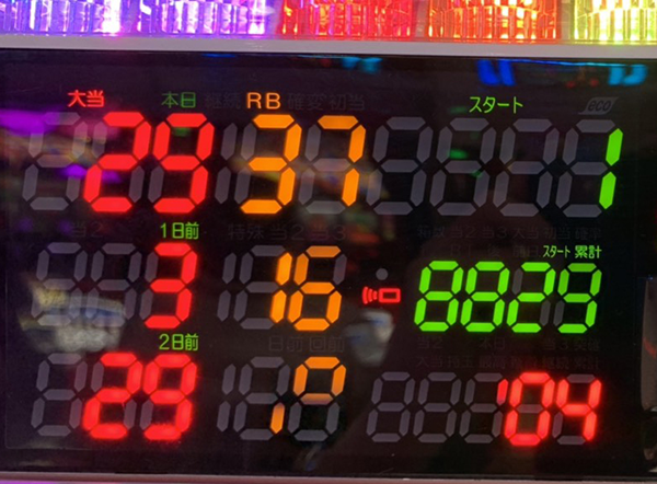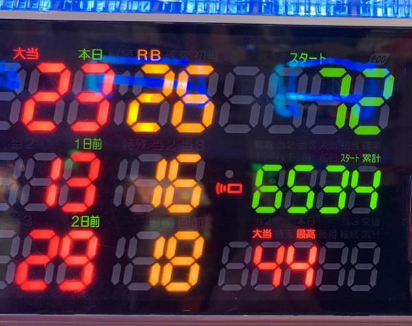 4500Gを超えた頃から短いゲーム数でボーナスを獲得するシーンが増えていき、通常時を消化するスピードが徐々に落ちていくも18時頃には6500Gに到達。1万回転達成を狙えるペースを保ちながら、夜を迎えることとなった。