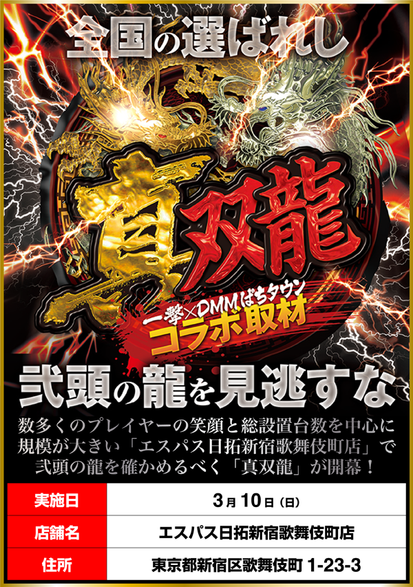談笑をしながら遊技をおこなっている姿も多く、ホール全体が明るいムードに包まれていた「エスパス日拓新宿歌舞伎町店」。「ニューキングハナハナ-30」をはじめ、たくさんの場所でプレイヤーの笑顔に出会えた「真双龍」となった。