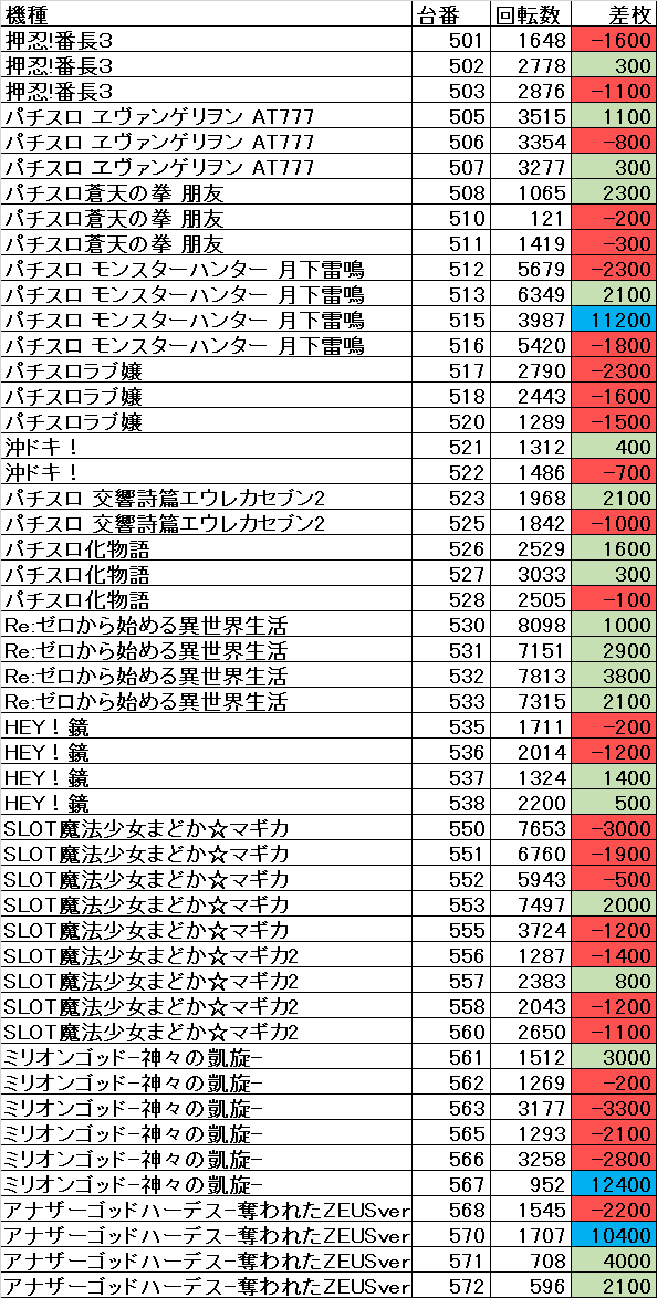 朝から人気だった機種は『SLOT魔法少女まどか☆マギカ』、『SLOT魔法少女まどか☆マギカ2』、『Re:ゼロから始める異世界生活』、『パチスロ モンスターハンター 月下雷鳴』、『押忍!番長3』でした。