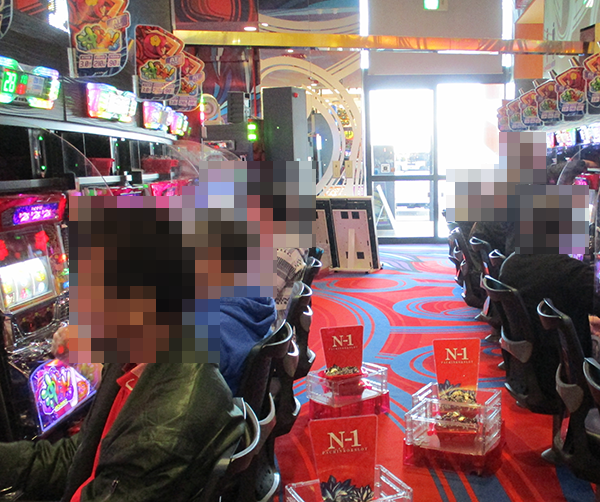 稼働率の高さを超えるほどの大きな盛り上がりが感じられた「エヌワン西新発田店」。戦国武将のごとく活躍をしているプレイヤーたちによって、ホール全体に笑顔が広がっていた。