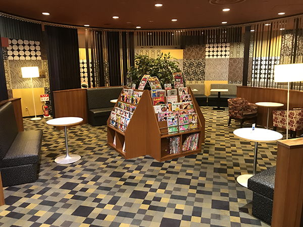 華やかな柄の壁紙が特徴的なレストコーナーには、長いソファやひとりがけ用のイスが置かれている。観葉植物やオシャレな照明もあるラウンジのようなスペースであり、リラックスするには最適な場所だと思えた。