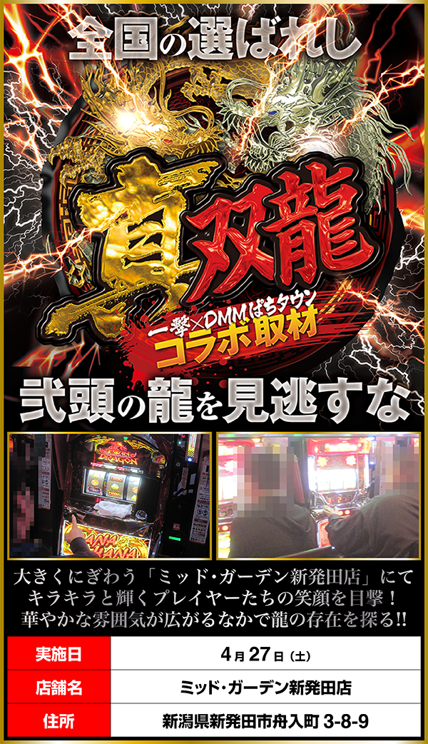 「ツインドラゴンハナハナ‐30」などのハナハナシリーズを筆頭に、さまざまな機種が盛り上がっていた「ミッド・ガーデン新発田店」。たくさんのステキな笑顔に出会えた「真双龍」であった。