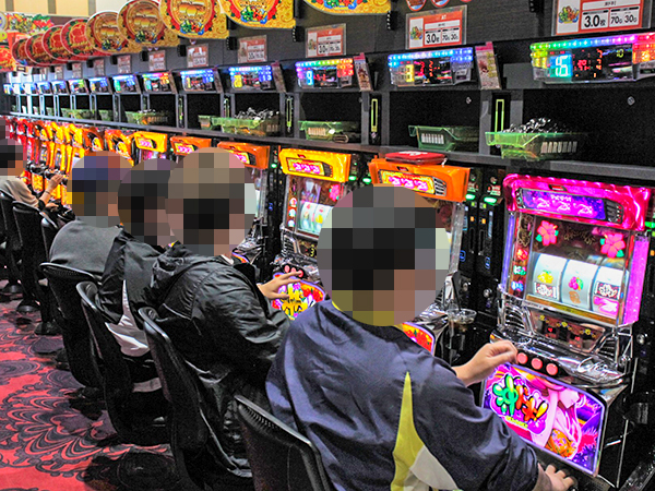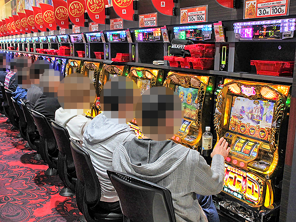 5.556円/1枚パチスロも高稼働。様々な機種で楽しそうにレバーを叩くプレイヤーが見られた。