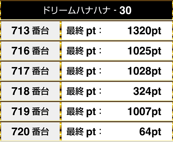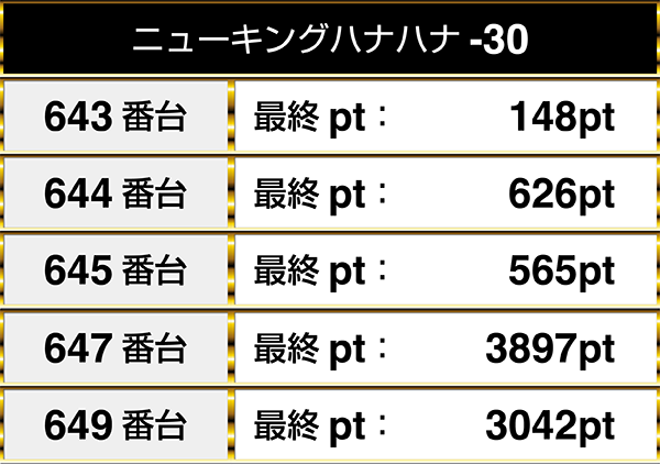 『ニューキングハナハナ-30』は2台が3000ptオーバーを記録し、10台中5台がプラスptとなっていた。