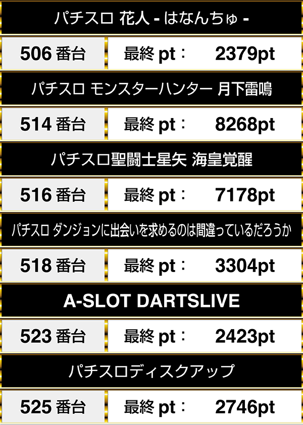 『パチスロ聖闘士星矢 海皇覚醒』や『パチスロ ダンジョンに出会いを求めるのは間違っているだろうか』など、6機種以上に2000ptオーバーのデータが残っていた。