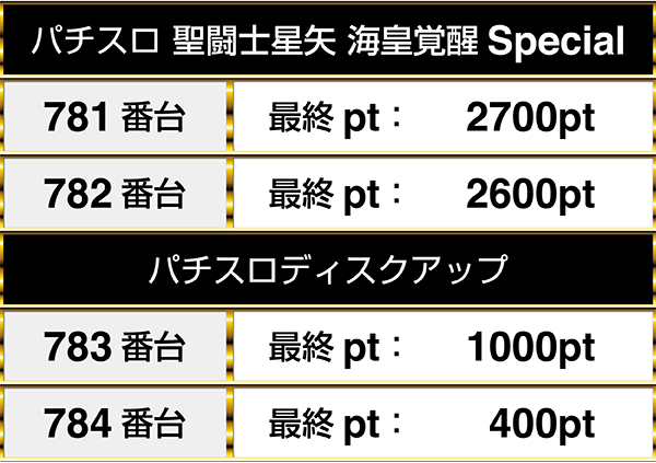 『パチスロ 聖闘士星矢 海皇覚醒Special』や『パチスロディスクアップ』など、さまざまな機種が並んでプラスptを達成!