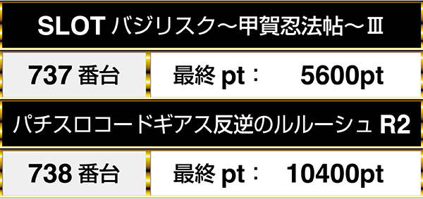 『SLOTバジリスク〜甲賀忍法帖〜Ⅲ』と『パチスロコードギアス反逆のルルーシュR2』が2台並びで5000ptオーバー!!