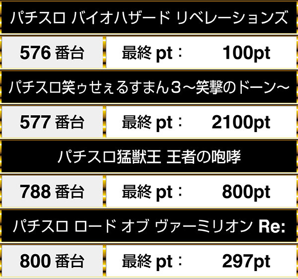 また、さまざまな機種で構成されたシマでは、『パチスロ猛獣王 王者の咆哮』や『パチスロ笑ゥせぇるすまん3〜笑撃のドーン〜』など、機種をまたいでプラスptが連なっているデータも残っていた。