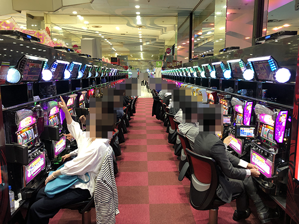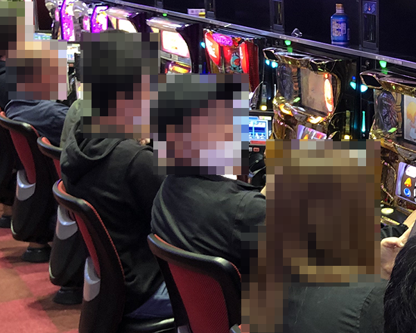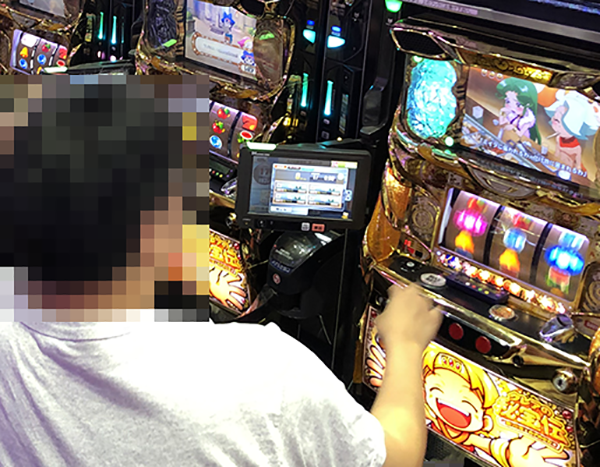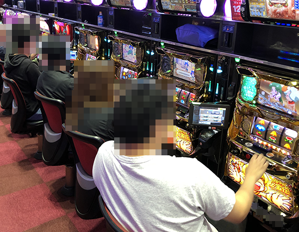 シマの真ん中に設置されている4台すべてに、笑顔で遊技をおこなうプレイヤーの姿があった。うれしそうにレバーを叩く姿が並んでいる光景は壮観だ。