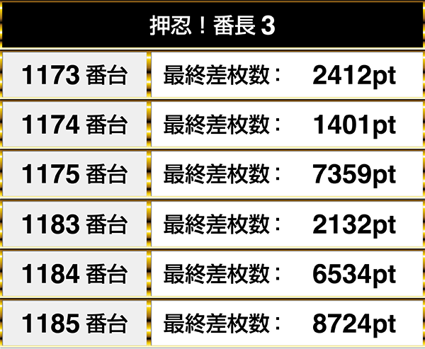 3台並びでプラスptとなる場所が2箇所あり、そのうちの3台は6000ptオーバーを記録!