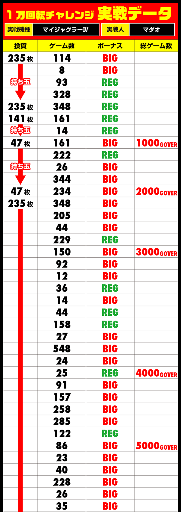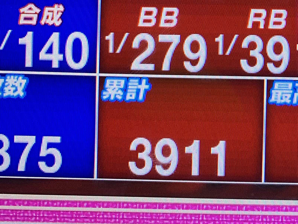 しかし、4000Gを過ぎたあたりからBIGの連チャンが訪れ、ゲーム数を消化するペースが急激にダウン…。