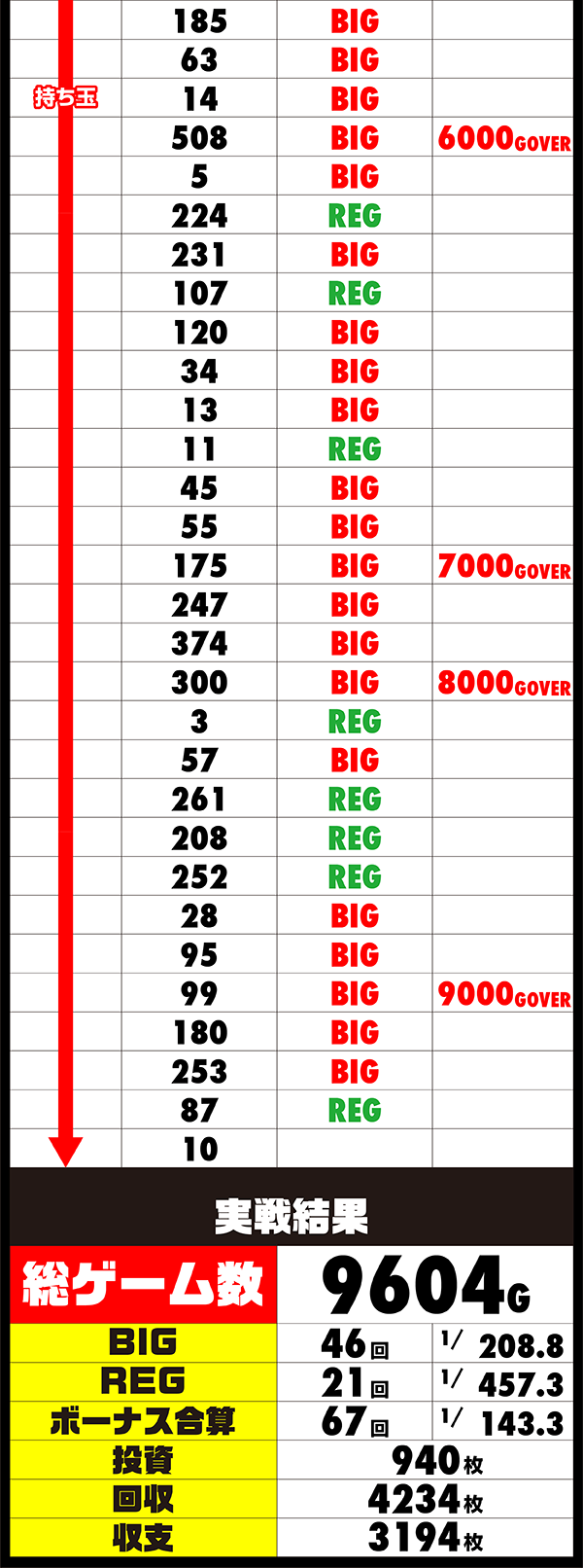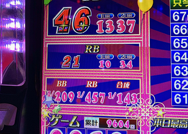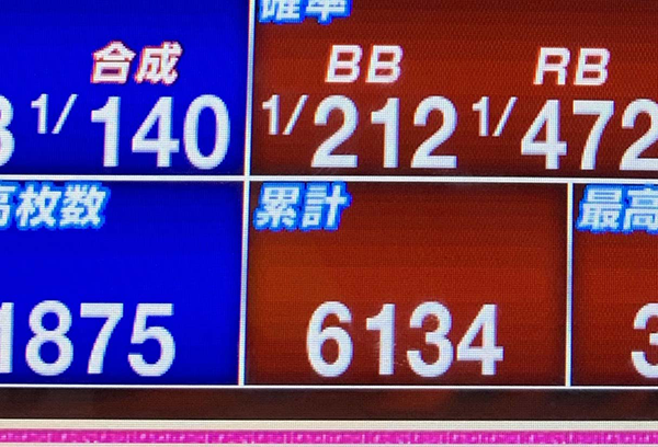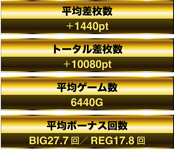 平均ゲーム数は約6400Gで、平均ボーナス回数はBIGとREGをあわせると40回オーバー。
