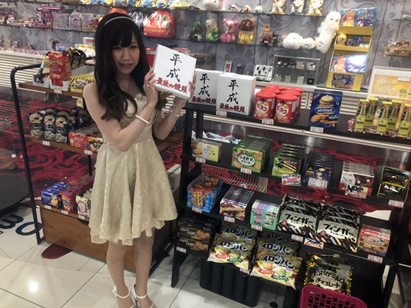 お菓子が並ぶ棚には、平成最後の饅頭があり、ふみちゃんも手にとってチェック♪