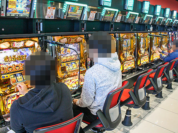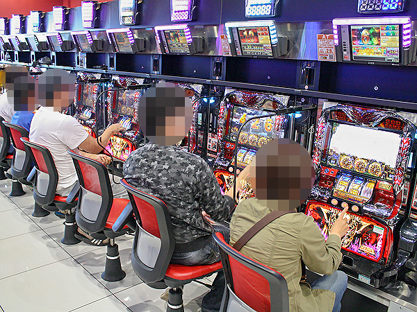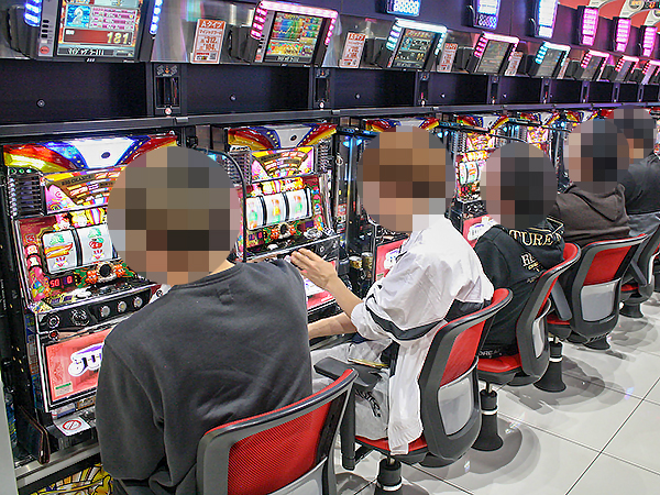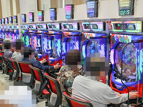 取材時の店内には多くのプレイヤーが来店。パチンコ・パチスロともに、様々な機種が支持を集めていた。