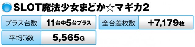 また、『SLOT魔法少女まどか☆マギカ2』も好調で、11台中5台がプラスで全台差枚数は+7,179枚をマーク。