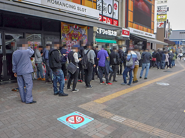 開店前から約150人ものプレイヤーが列を形成。各人とも遊技を待ちきれない様子だった。