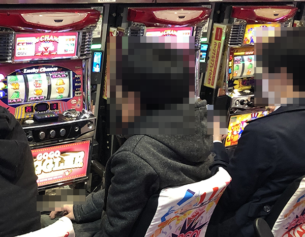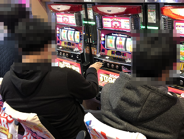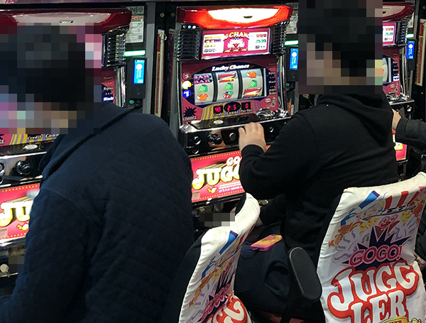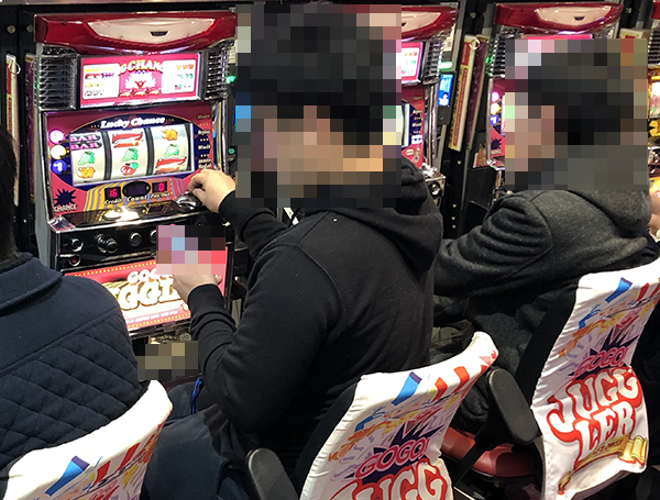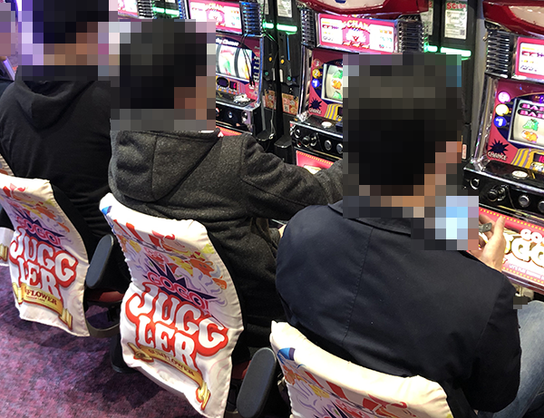 パチスロの様子をうかがうと、AT・ART機やボーナスタイプなど、幅広いスペックの機種に対する支持が厚い。パフォーマンスを披露しているプレイヤーたちがいるなかで、「ゴーゴージャグラー」が存在感を放っていた。