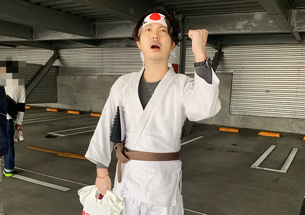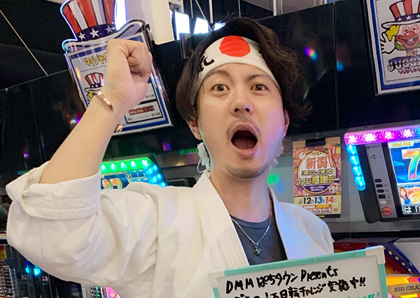 ハチマキをビシッと巻き、気合いのはいった道着姿で来店。帯は茶色だが、「マイジャグラーⅢ」でおこなうチャレンジでは黒帯級の見事な活躍をみせてほしいところだ。