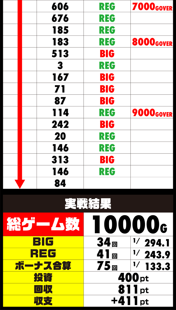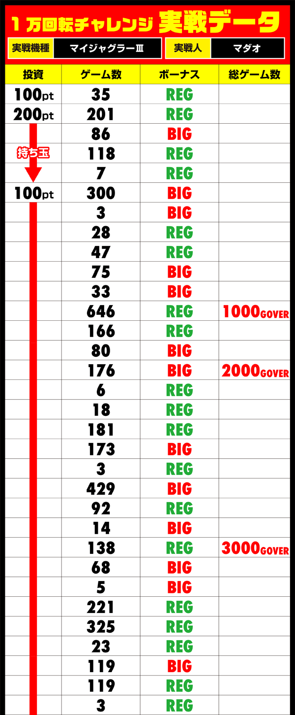 チャレンジの展開はというと、適度にボーナスを獲得しながらしっかりと打ち進めていき、18時頃には6700Gを通過。その後は600Gや500Gなどのハマリを活かして、一気にゲーム数を稼ぐ!