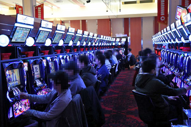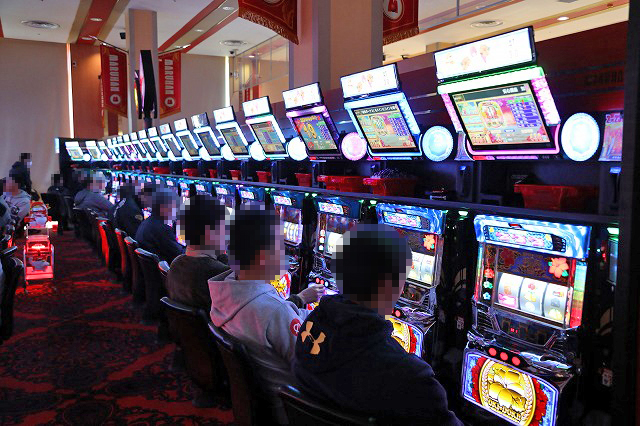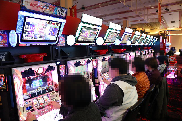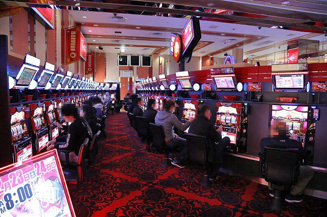 メダルの別積みで塞がれた、パチスロエリアの通路は必見!