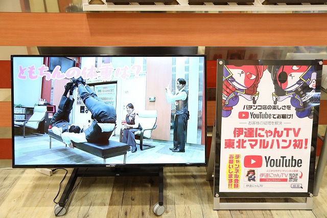 | YouTube伊達にゃんTVでは、同店のオリジナル動画が視聴可能。無料のWi-Fiを繋げば通信料を気にせず、遊技中にもチェックできる。 | |