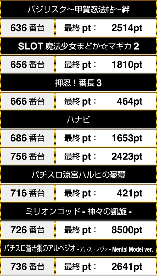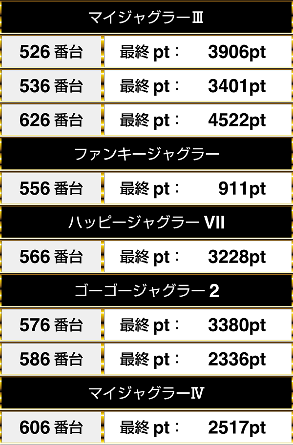 最終的なデータでは、626番台の『マイジャグラーⅢ』や576番台の『ゴーゴージャグラー2』などが3000ptオーバーを記録。