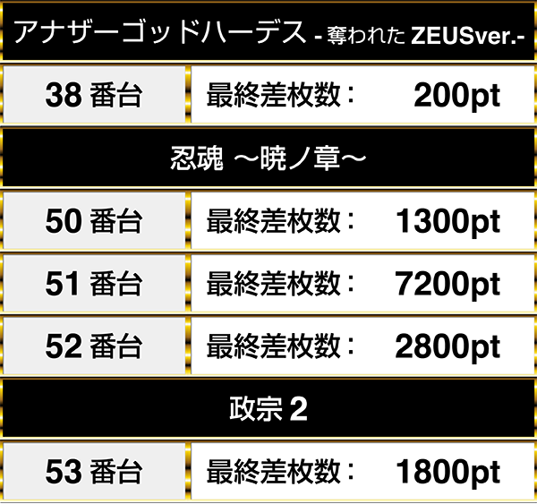 『忍魂 〜暁ノ章〜』は3台すべてがプラスptとなっており、そのうちの1台は7000ptオーバー!!