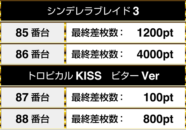 『シンデレラブレイド3』と『トロピカルKISS ビターVer』も連なって2台ずつがプラスpt!