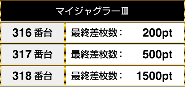 ジャグラーシリーズの『マイジャグラーⅢ』も、3台が固まってプラスptを記録していた。
