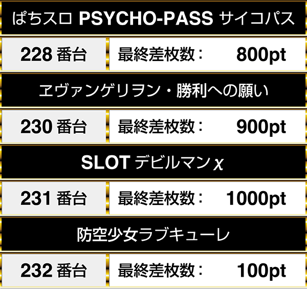 『ぱちスロ PSYCHO-PASS サイコパス』や『ヱヴァンゲリヲン・勝利への願い』など、機種をまたいで合計4台が並んでプラスpt!