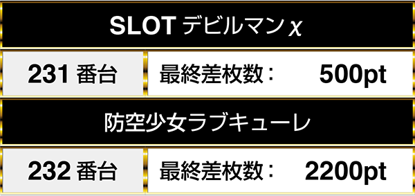 「SLOTデビルマンχ」と「防空少女ラブキューレ」の2機種が並んでプラスptを記録。