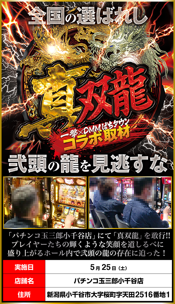 弐頭の龍の存在を確かめるべく「真双龍」をおこなった。舞台となったのは、レンガ調のオシャレな外観も特徴的な「パチンコ玉三郎小千谷店」。