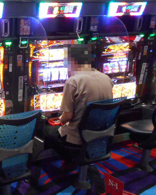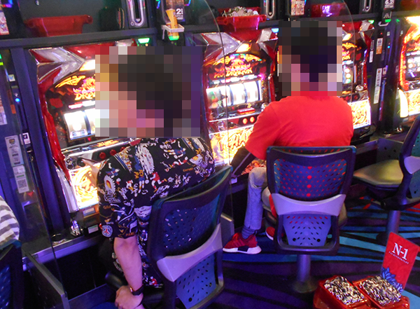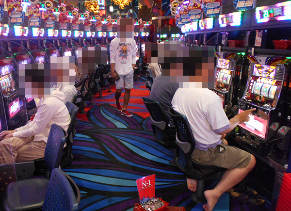 20円パチスロと5円パチスロの各シマで、満面の笑みを浮かべている勇姿を確認。