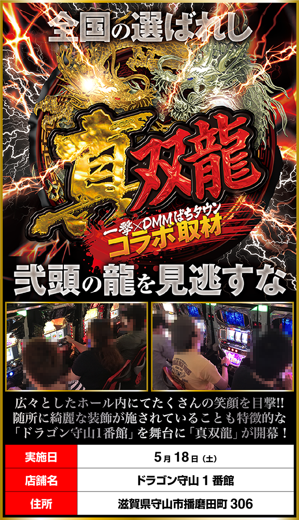 「パチスロ猛獣王 王者の咆哮」を筆頭に、さまざまなスペックの機種が盛り上がっていた「ドラゴン守山1番館」。プレイヤーの笑顔と活躍する姿が印象に残る「真双龍」であった。