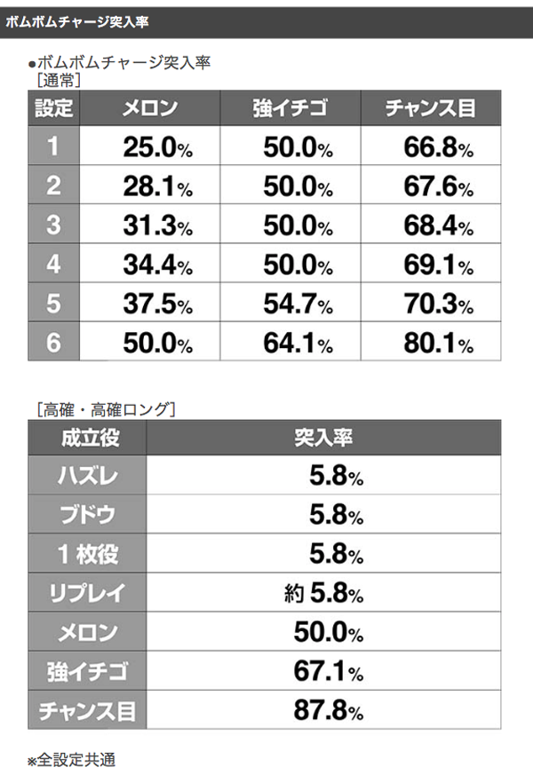 高設定ほど、レア役からのボムボムチャージ突入率が高い。