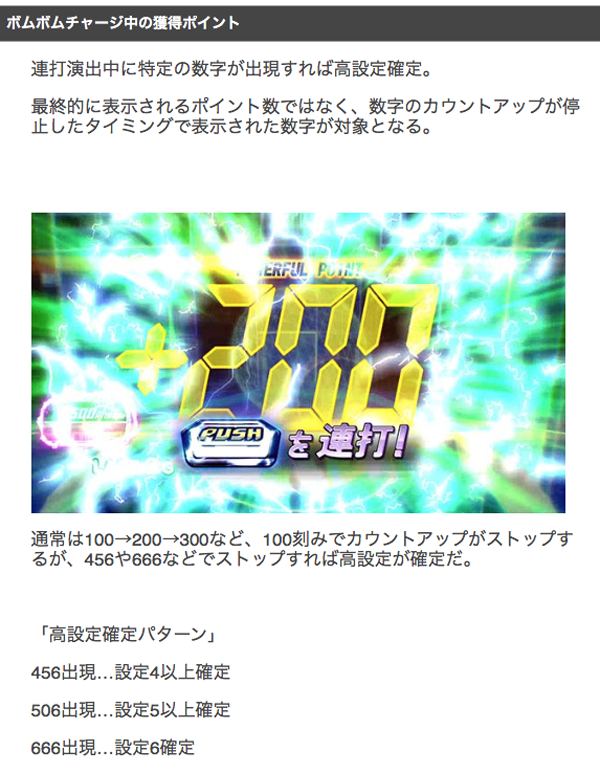 ボムボムチャージ中のポイントを獲得した際に表示される数字にも設定を示唆する要素があり、666が出現すれば設定6が濃厚だ。