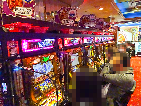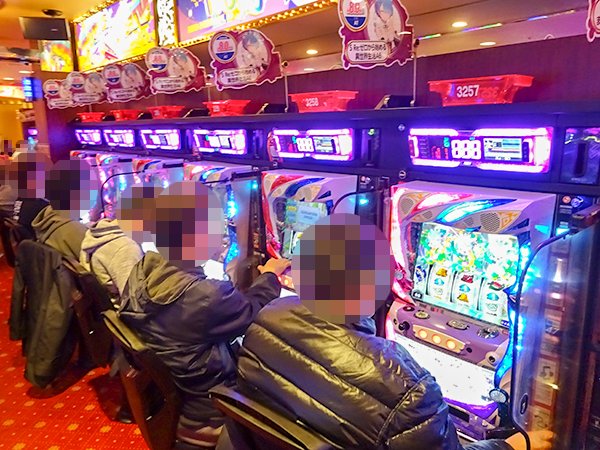 1000円/100枚パチスロは全体的に高稼働。空き台が見当たらないほどの盛況ぶりだった。