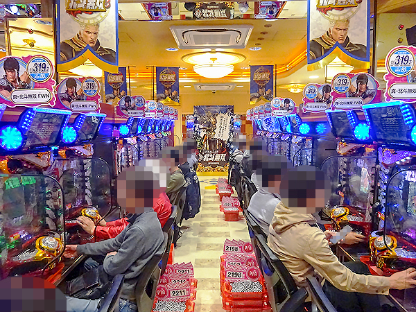 14時過ぎの4円パチンコの様子を見ると「ぱちんこCR真・北斗無双」や「PフィーバーアクエリオンW 最終決戦ver.」が大盛り上がり。機種性能を存分に発揮するプレイヤーを目の当たりにしている。