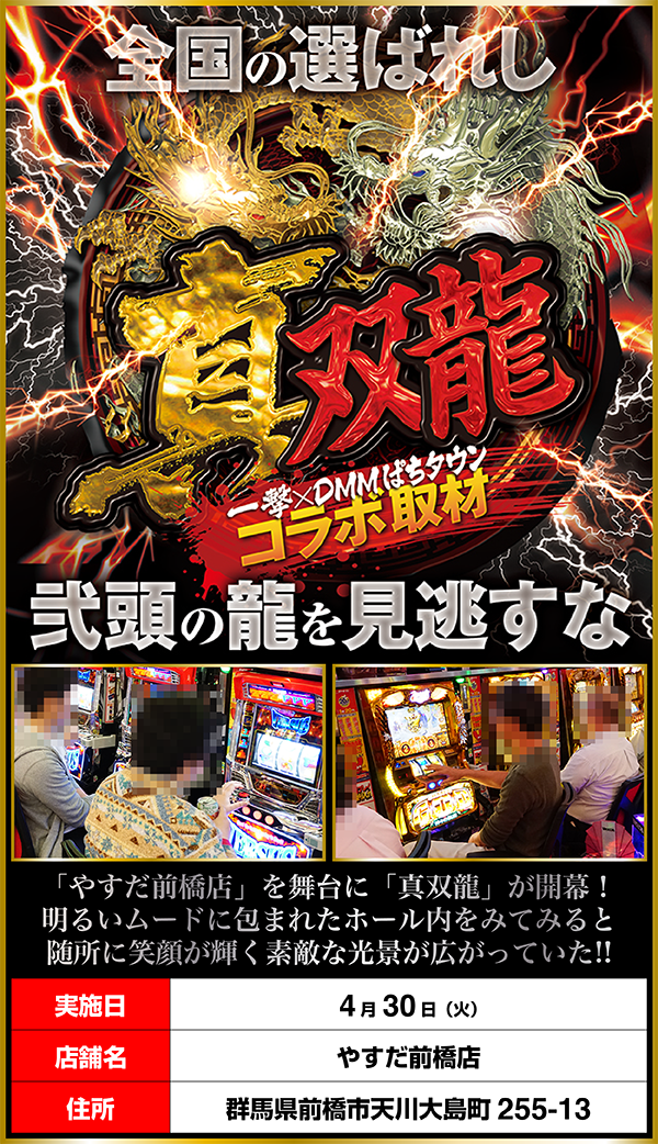 遊技面にくわえ、環境面や設備面などからも魅力が感じられる「やすだ前橋店」にて、数々の鮮やかな光景を目にした「真双龍」となった。